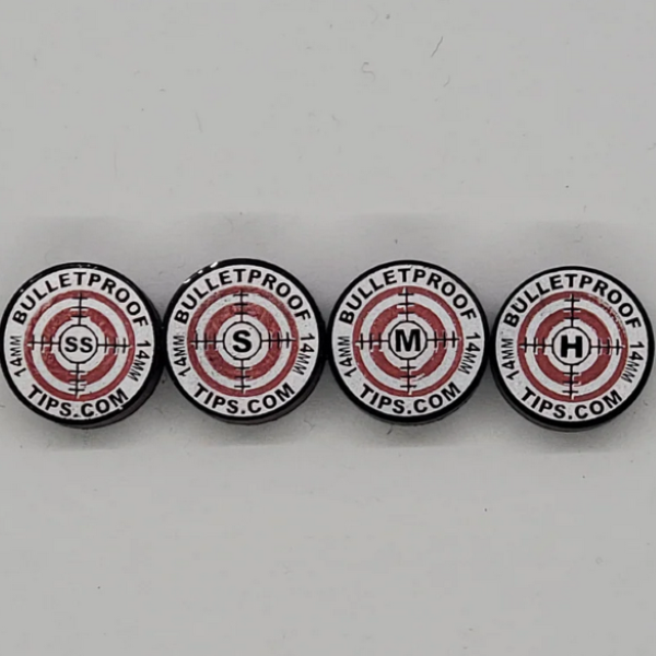 Bulletproof A.I.M (Accuracy Improving Multi-Layer) playing tips are made from 11 layers of hand-selected premium Japanese pigskin. More layers mean better consistency, less mushrooming, and increased performance. Bulletproof A.I.M Tips are available in 14MM and come in Super Soft, Soft, Medium, and Hard to give every player the feel they desire. From the company that brought you the world's greatest break tips comes the next level in playing tips. Take A.I.M at your competition!